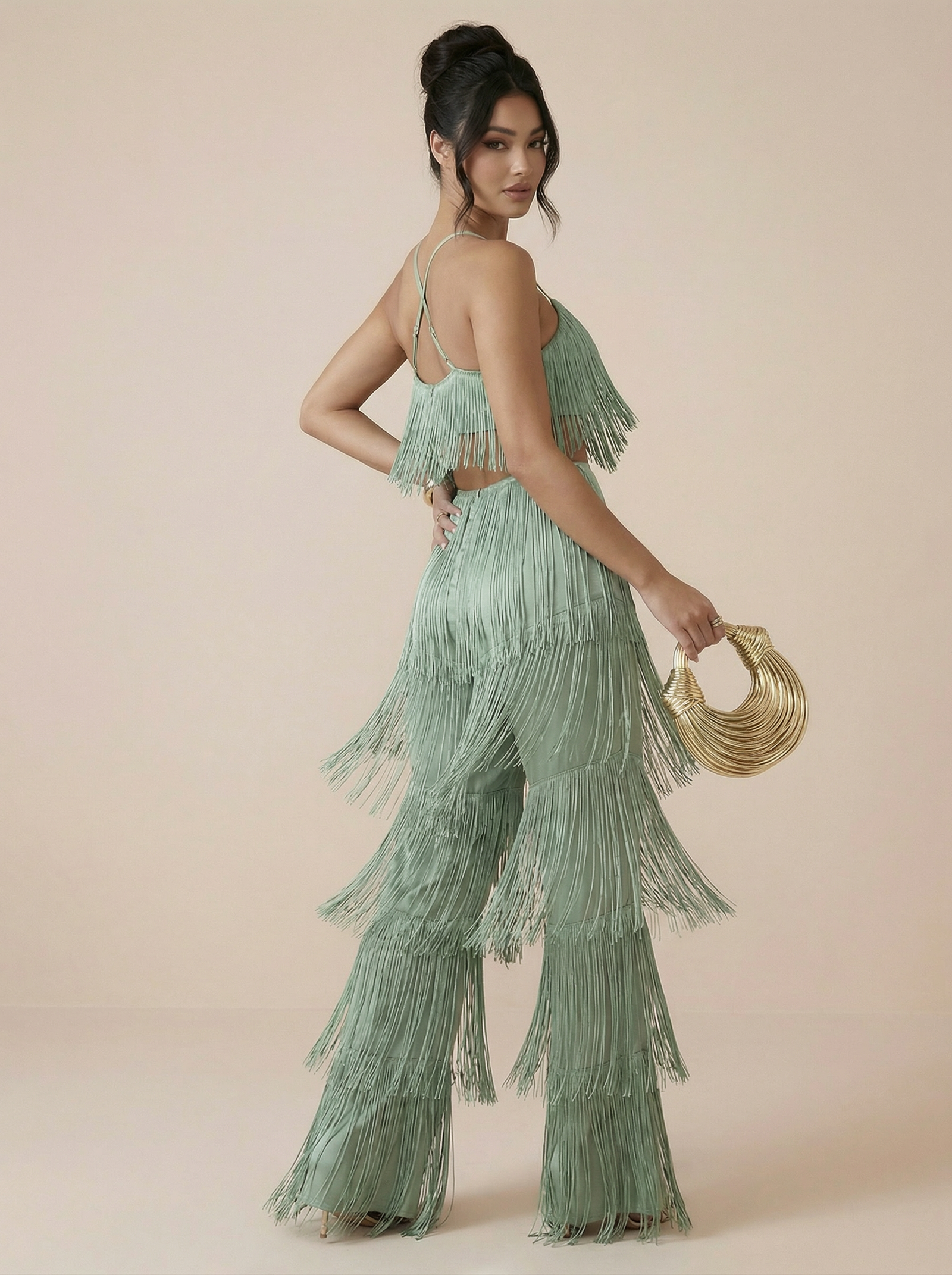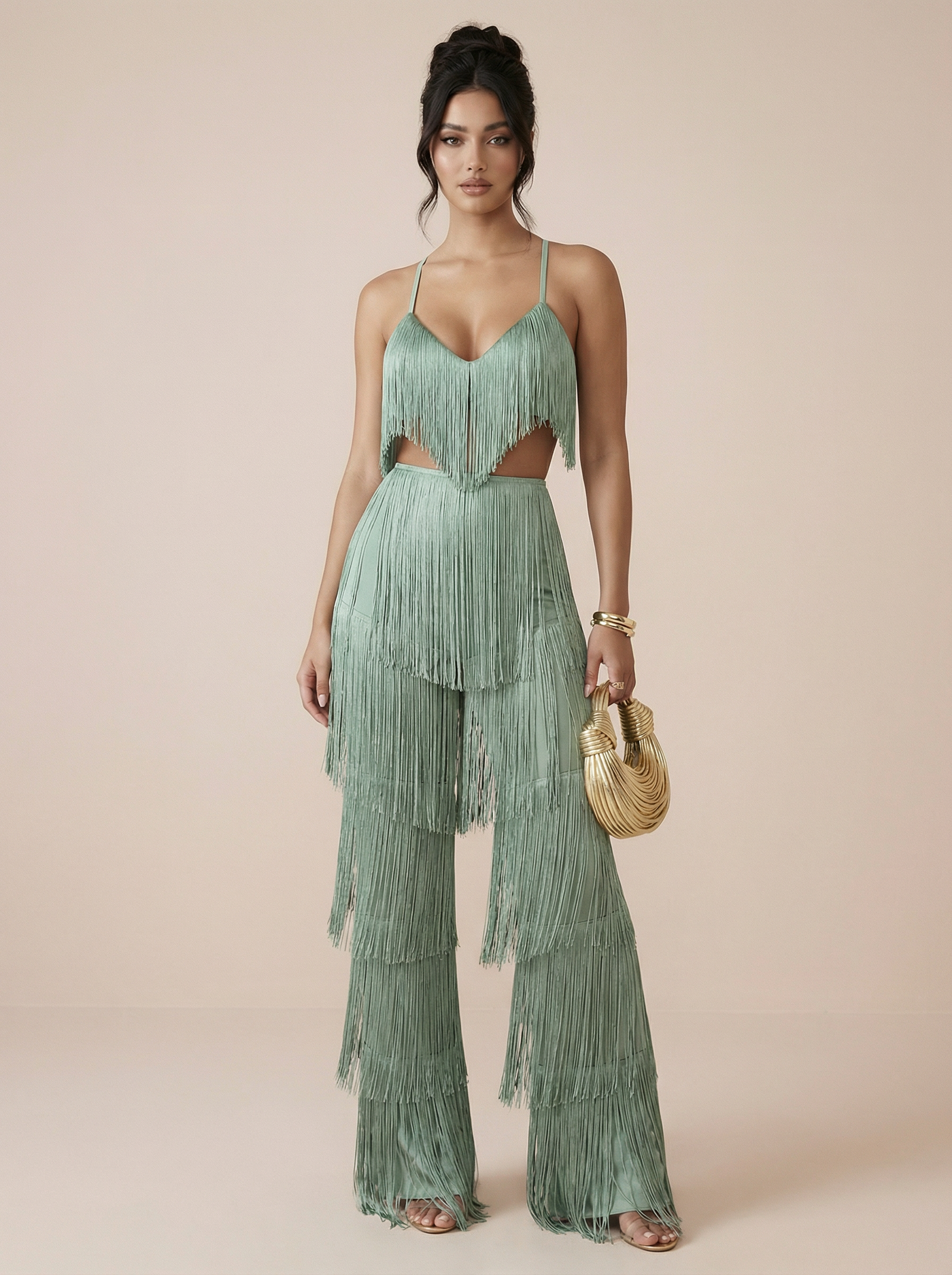 Green Two Piece Tassel Top & Trousers Set