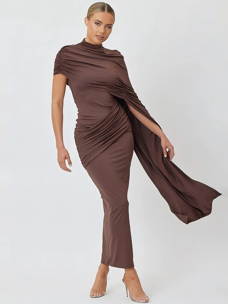 • Brown Oblique One Shoulder Bodycon Maxi Dress