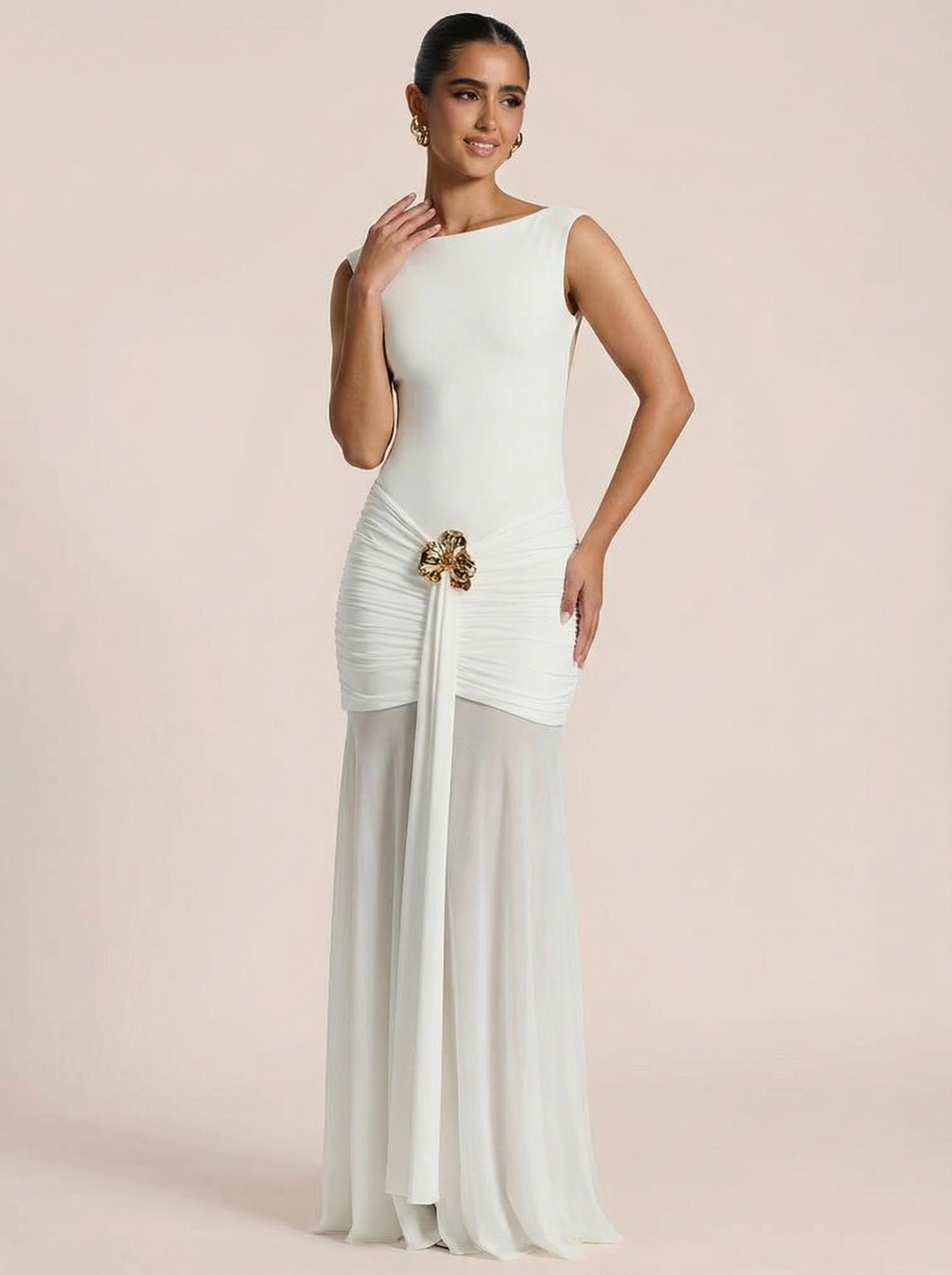 • Elegant Strapless Scarf Pleated Maxi Dress