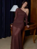 • Brown Oblique One Shoulder Bodycon Maxi Dress