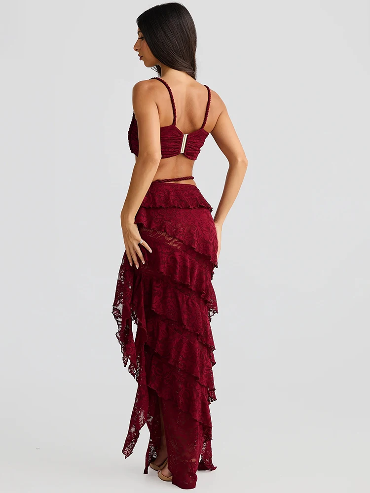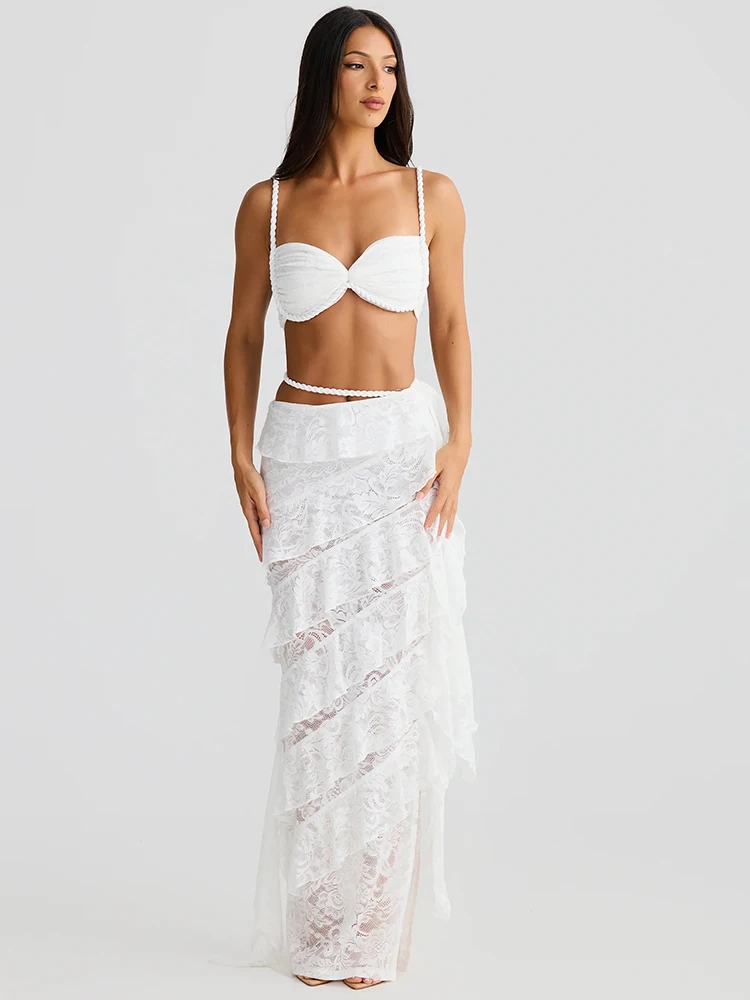Summer Lace Two Piece Sets Fashion Strapless Crop Tops And Maxi Skirt Elegant Beach 2 Piece Set
